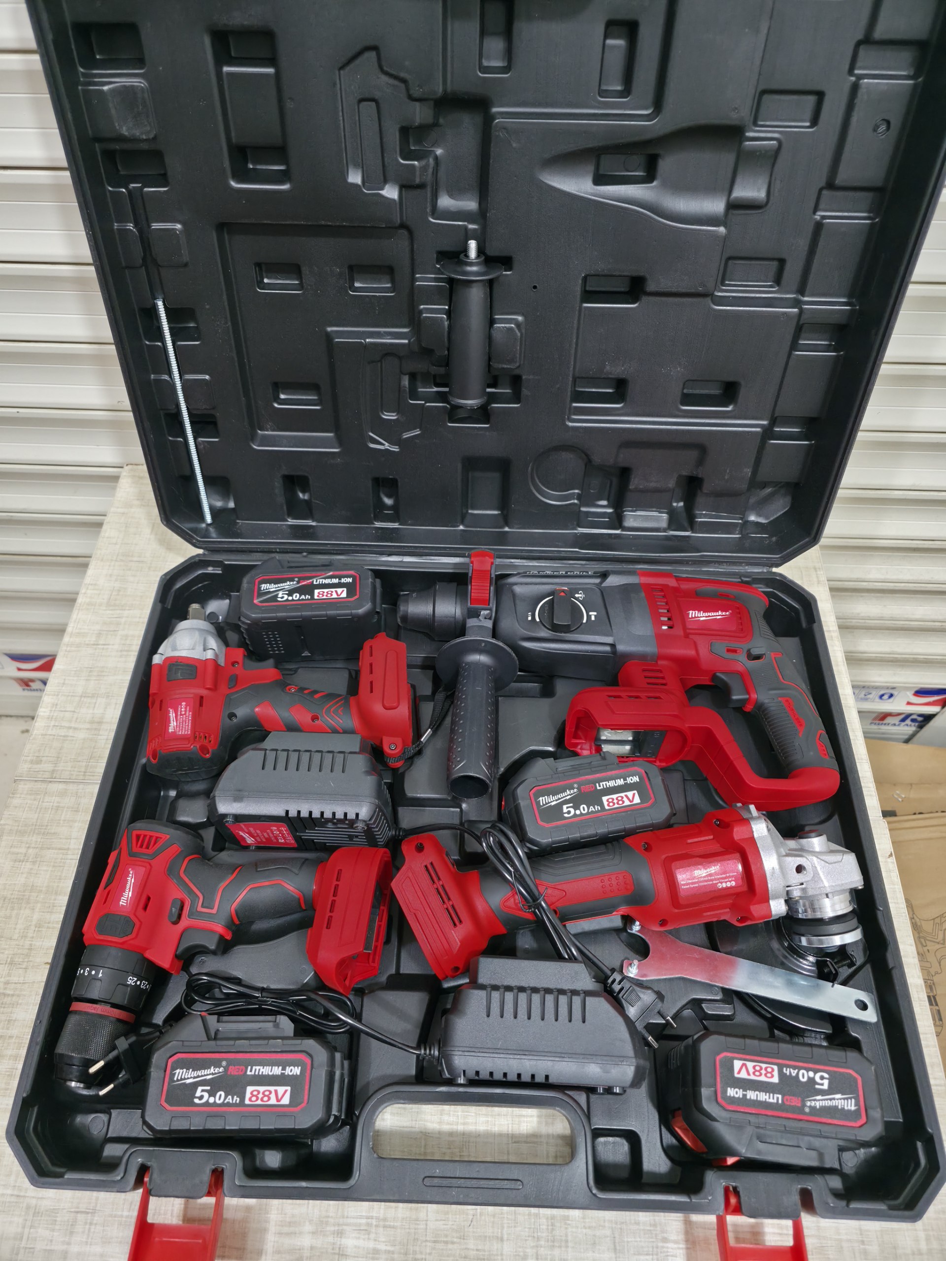 پک 4قلوی میلواکی متور براشلس محصول (دریل+هلتی+سنگ+بکس) ولت88 باطری 4عدد آمپر 5 A شارژر 2عدد وزن پک 10.500 g
